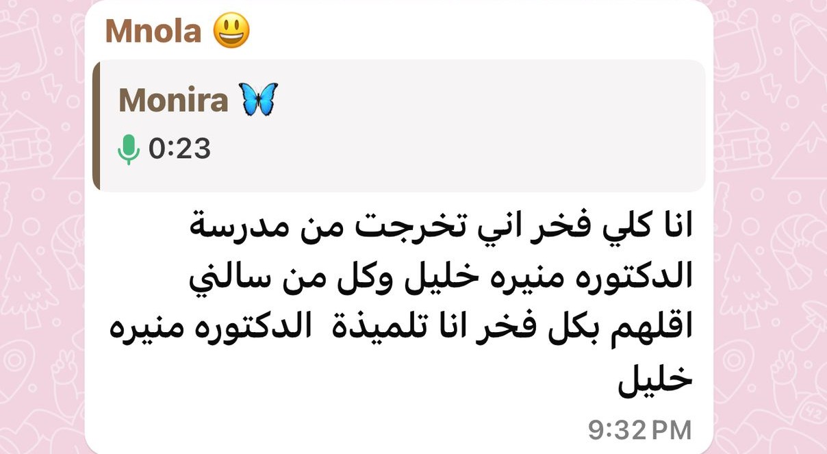 انا كلي فخر اني تخرجت من مدرسة الدكتوره منيره خليل وكل من سالني اقلهم بكل فخر انا تلميذة الدكتوره منيره خليل